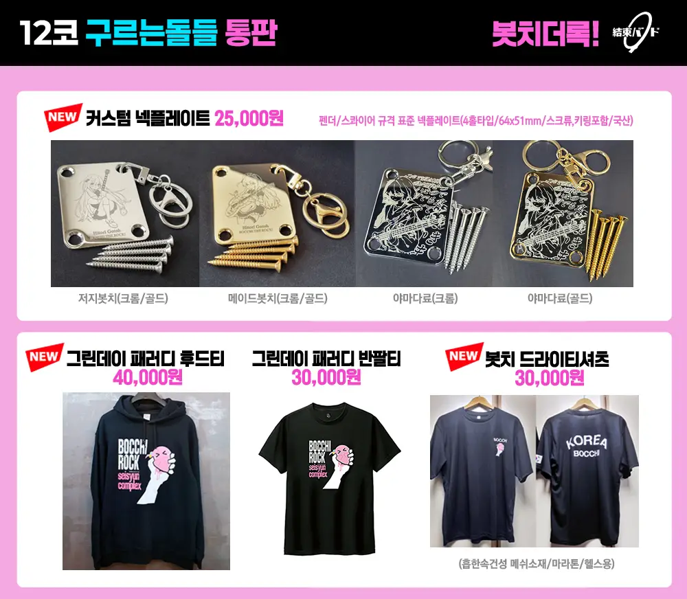 넥플레이트, 기타피크, 드럼스틱 키링, 티셔츠 등 몇 제품은 주문제작 방식이기 때문에 해당 상품들이 포함된 주문 건은 제작 완료 후 일괄 발송됩니다. 준비 되는대로 최대한 빠르게 발송해드리겠습니다! 감사합니다~